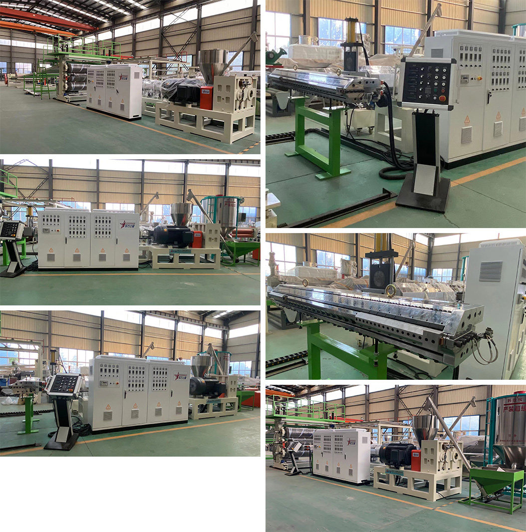 該生產(chǎn)線采SJ-150-35比1單螺桿排氣擠出機、西門子電機、高扭矩硬齒面減速機、液壓換網(wǎng)器、T型衣架式可調(diào)模具、立式三輥壓光機、并可根據(jù)客戶需求配備在線覆皮革裝置、三合一水溫機、不銹鋼冷卻托架裝并裝有寬幅可調(diào)切邊刀、橡膠輥牽引機、自動定尺剪板機。生產(chǎn)線采用立體電控柜:日本歐姆龍智能溫控儀、西門子低壓電器、國內(nèi)外馳名變頻器。所生產(chǎn)的板材經(jīng)二次熱成型后,主要于汽車儀表板、車門內(nèi)裝板、代步車、高爾夫汽車等外殼;還可用于各種拉桿箱、行李箱等。