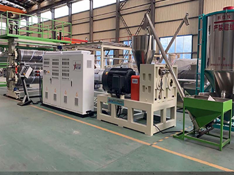該生產(chǎn)線采SJ-150-35比1單螺桿排氣擠出機、西門子電機、高扭矩硬齒面減速機、液壓換網(wǎng)器、T型衣架式可調(diào)模具、立式三輥壓光機、并可根據(jù)客戶需求配備在線覆皮革裝置、三合一水溫機、不銹鋼冷卻托架裝并裝有寬幅可調(diào)切邊刀、橡膠輥牽引機、自動定尺剪板機。生產(chǎn)線采用立體電控柜:日本歐姆龍智能溫控儀、西門子低壓電器、國內(nèi)外馳名變頻器。所生產(chǎn)的板材經(jīng)二次熱成型后,主要于汽車儀表板、車門內(nèi)裝板、代步車、高爾夫汽車等外殼;還可用于各種拉桿箱、行李箱等。