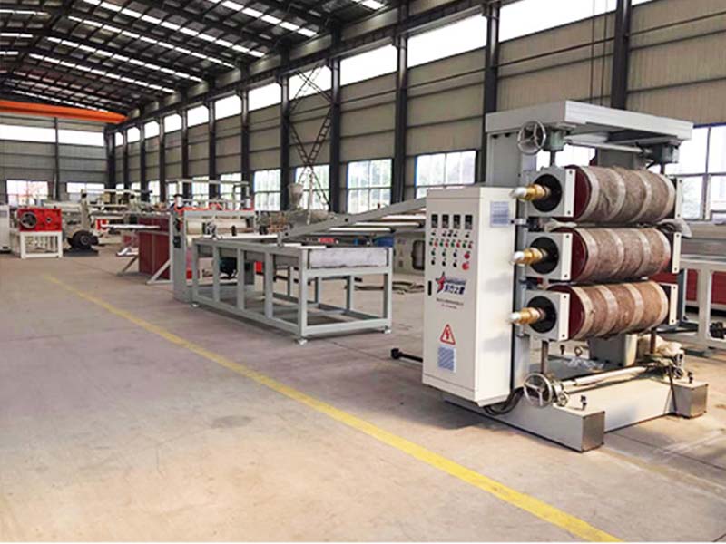 PVC透明軟門簾生產(chǎn)線:可生產(chǎn)寬度200-600毫米、厚度0.8-3毫米的PVC透明塑料片材。該設(shè)備采SJ90或SJ-120單螺桿擠出機(jī)、T型彈性??诳烧{(diào)模具、立式或斜45度三輥壓光機(jī)、三合一水溫機(jī)、不銹鋼冷卻托架裝并裝有寬幅可調(diào)切邊刀、橡膠輥牽引機(jī)、雙工位氣漲軸收卷機(jī)。所生產(chǎn)的片材表面光澤,通透無(wú)暇,柔軟,無(wú)裂縫、無(wú)異味、無(wú)氣泡、柔軟耐寒、耐磨、耐酸堿、耐腐蝕。